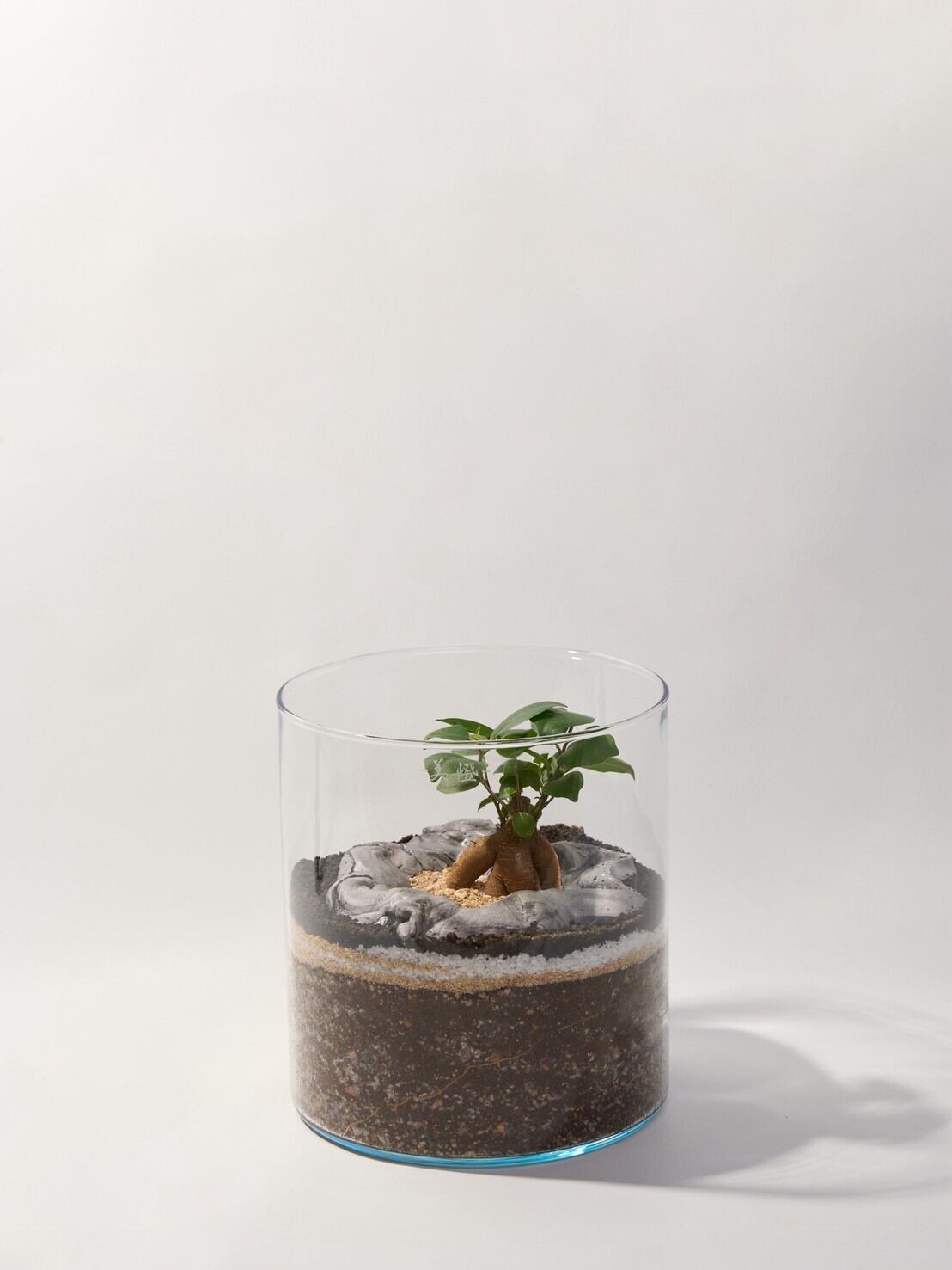 上質なシルバーとグレーのトーンでまとめた、大人のためのスイーツテラリウム。まるでホイップクリームのような質感を持つ特殊素材で、繊細な美しさを演出。静かにたたずむガジュマルが、洗練された空間にやさしい生命力を添えます。甘さを抑えたモダンな佇まいは、インテリアに上質なアクセントを加え、日常にさりげない癒しをもたらします。